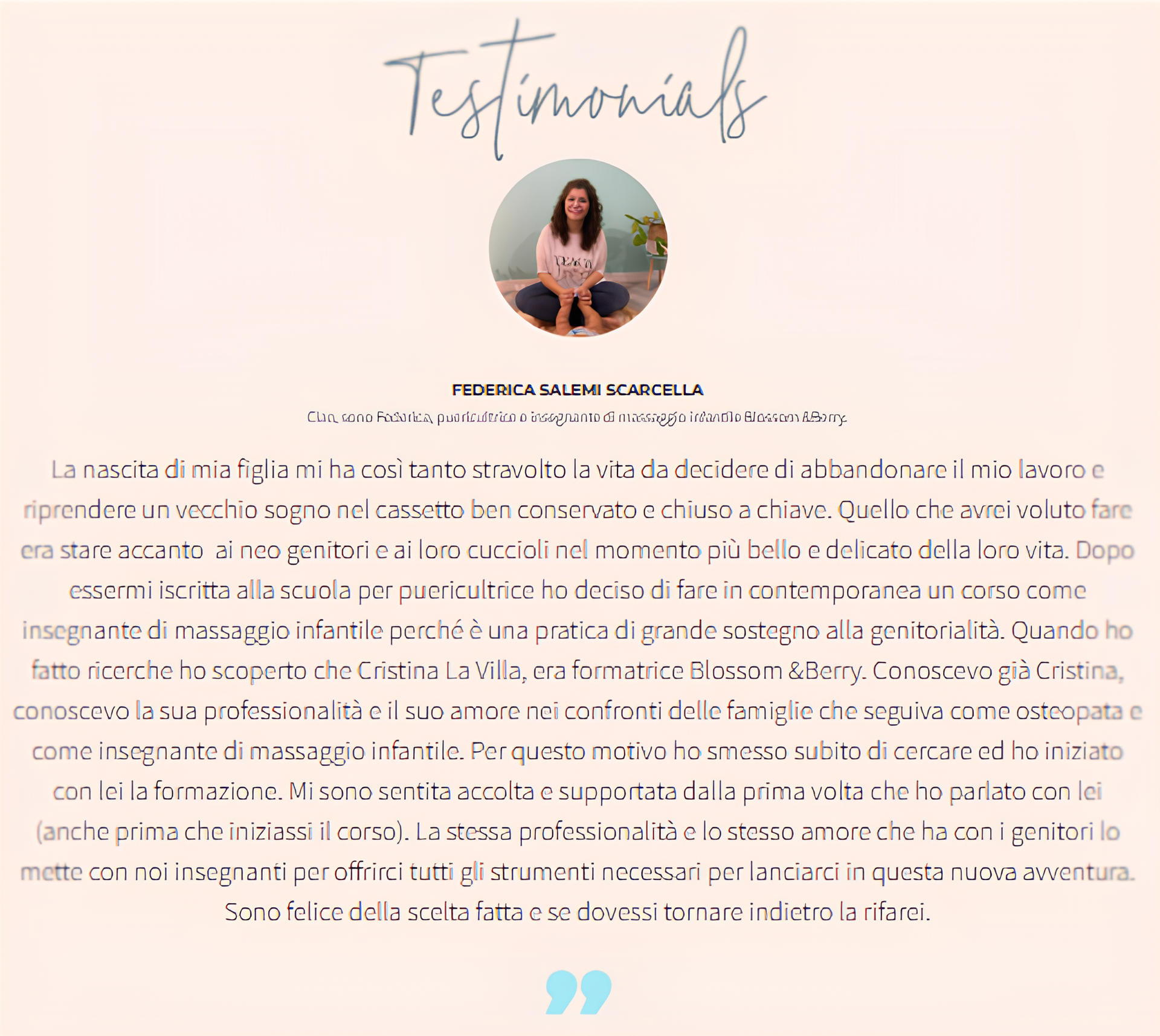 Questo corso, nato dalla mia esperienza di osteopata e mamma, unisce dieci anni di pratica e la formazione internazionale Blossom & Berry:
